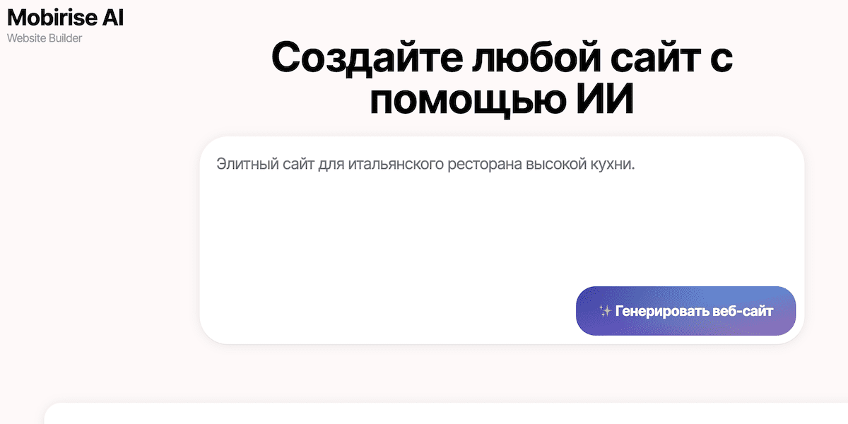 Mobirise AI — это современный инструмент для создания сайтов с помощью искусственного интеллекта, который позволяет генерировать полноценные веб‑страницы по простому текстовому запросу. Платформа ориентирована на пользователей без навыков программирования, предпринимателей, дизайнеров и всех, кто хочет быстро получить профессиональный сайт без сложных настроек. Сервис сочетает простоту, гибкость и мощные возможности ИИ, превращая процесс разработки в интуитивный и быстрый опыт.