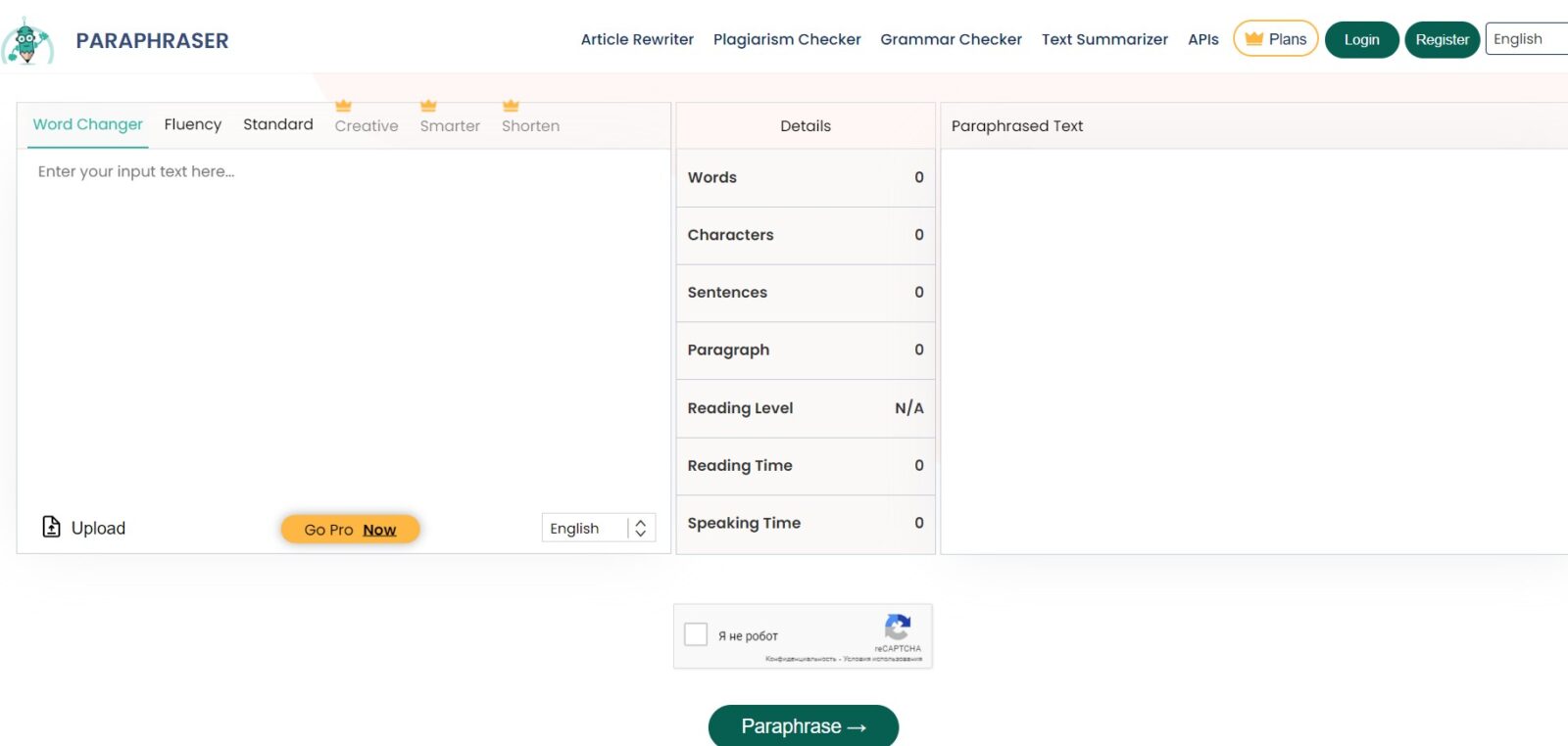 Введите текст вручную или загрузите файл. Выберите способ перефразирования. Доступно шесть различных режимов перефразирования.