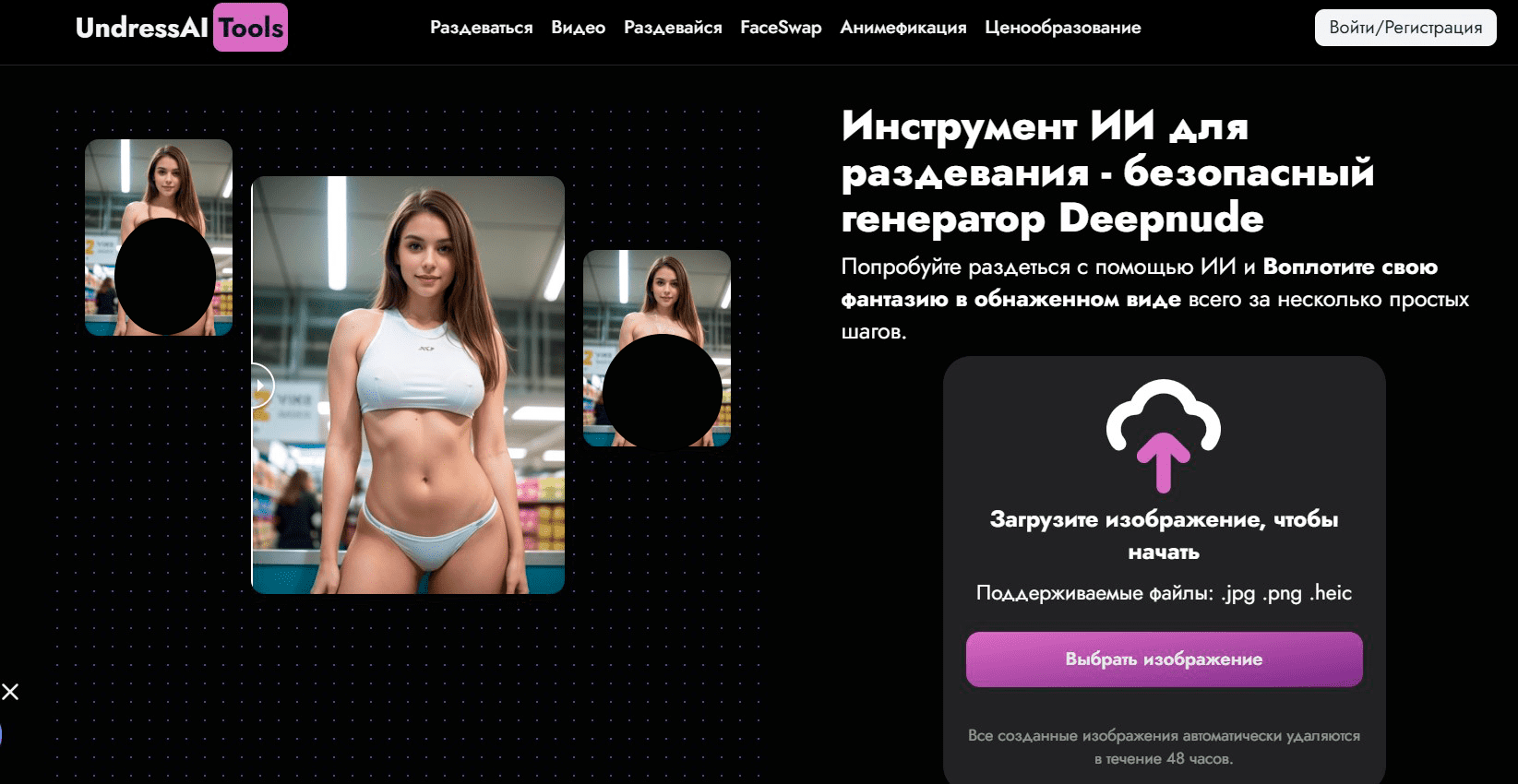 - Пользователь загружает фотографию, выбирает области одежды, которые нужно «удалить», и инструмент с помощью ИИ создает обнаженное изображение.