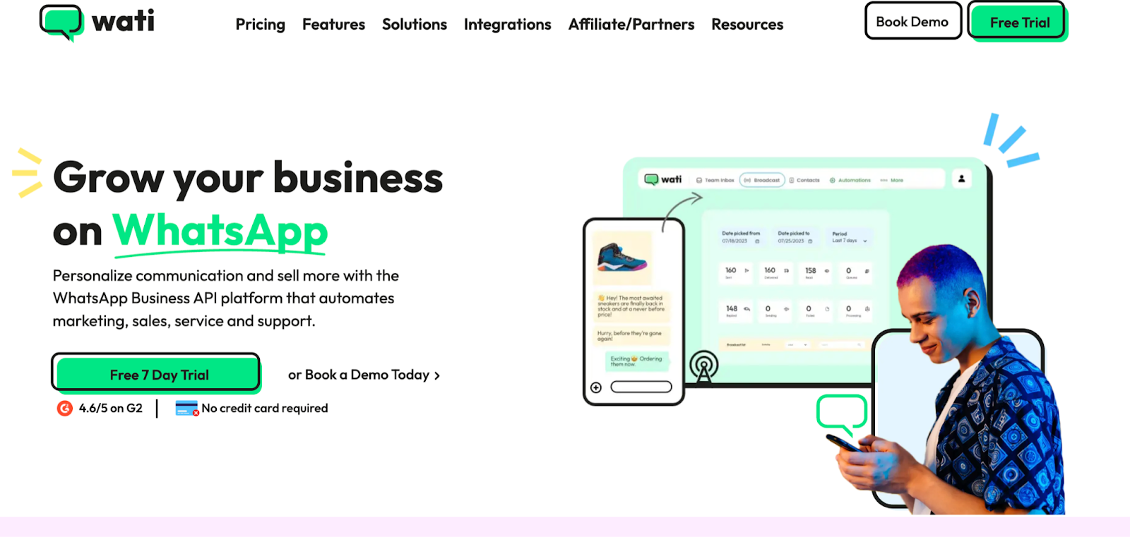 Главная фишка для нас — полная автоматизация общения через no-code конструктор чат-ботов. В нутре это позволяет переводить лида с лендинга сразу в мессенджер, где бот «дожмет» его консультацией, кратно повышая апрув. В гемблинге и беттинге Wati незаменим для ретеншена: рассылки по базе игроков с бонусами, персональными офферами или сигналами через официальный канал живут в разы дольше любых саморегов.