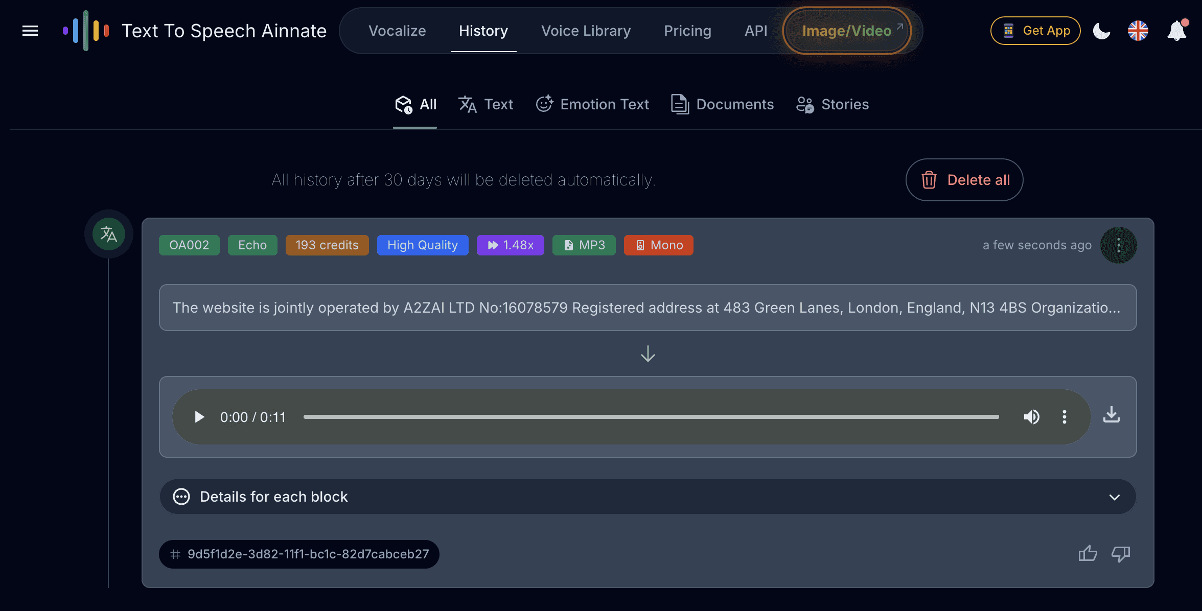 Основные действия происходят во вкладке Vocalize, в которой пользователь вводит текстовый контент и определяет параметры создания войса. Итоги генерации доступны в разделе History в верхней части интерфейса у поля Voice Library.