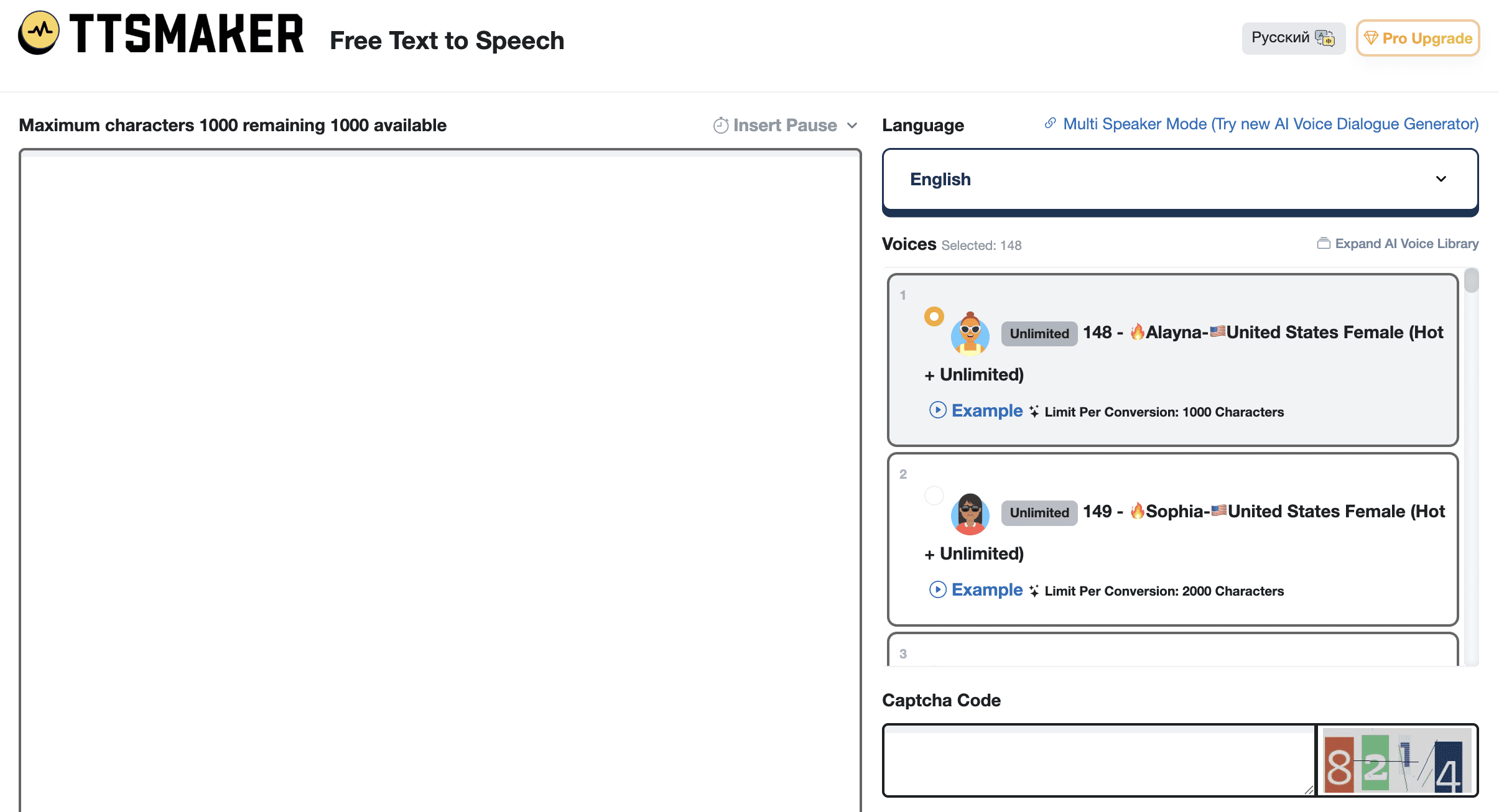 TTSMaker удивит своим лаконичным и ограниченным сервисом. Ресурс реализован на единственной странице для создания озвучки. Пользователю остается определиться с характеристиками голоса и ввести текстовое задание вместе с капчей.