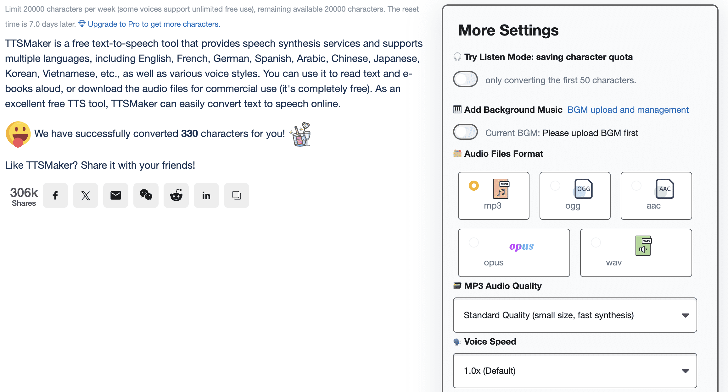 Доступ к параметрам войса находится на боковой панели справа. Скрытая панель More Setting у желтого поля Convert to Speech позволит провести тонкую голосовую настройку.