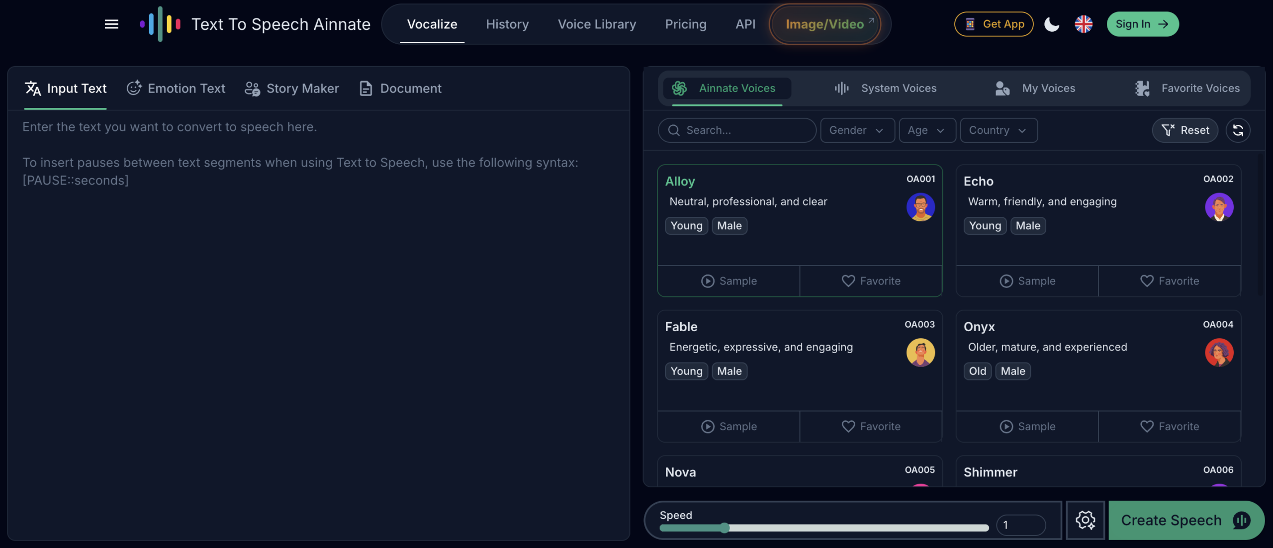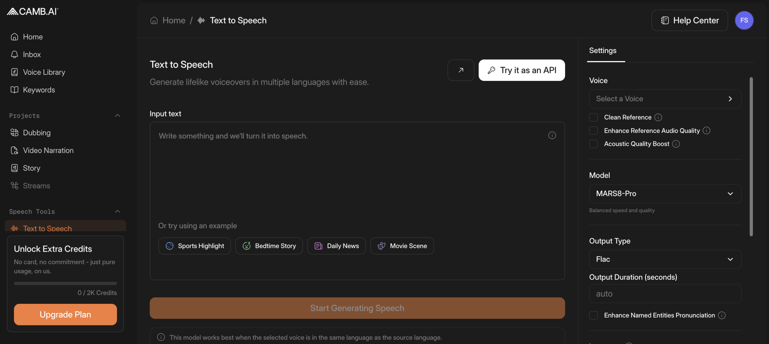 Работа с Camb AI предполагает авторизацию с последующим переходом в раздел Text to Speech. Пользователь вводит текст, выбирает голосовые настройки и активирует Generate Speech.