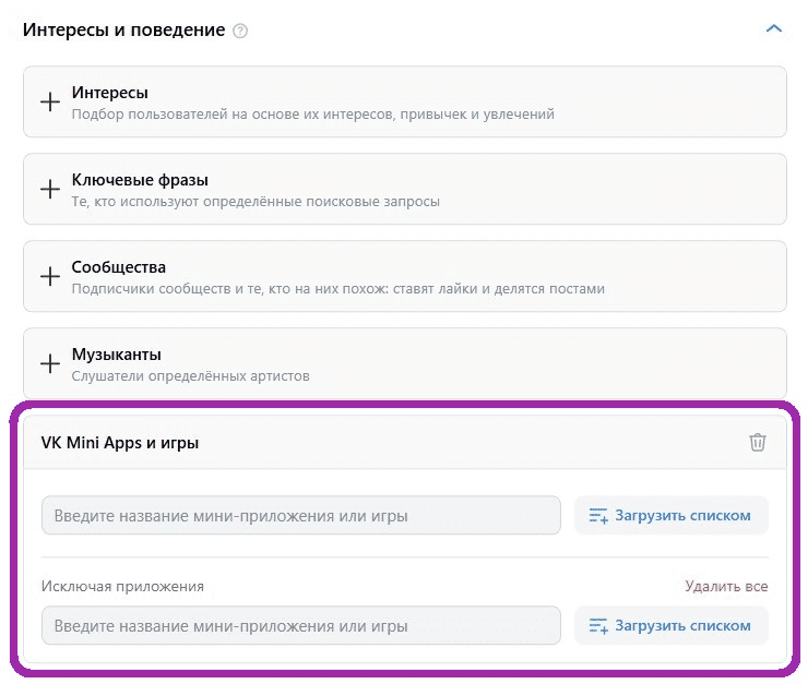 Совет. Используйте таргетинг «Интересы и поведение» — «Пользователи мини-приложений». Это аудитория, привыкшая взаимодействовать с интерфейсами внутри соцсети. Их проще конвертить.