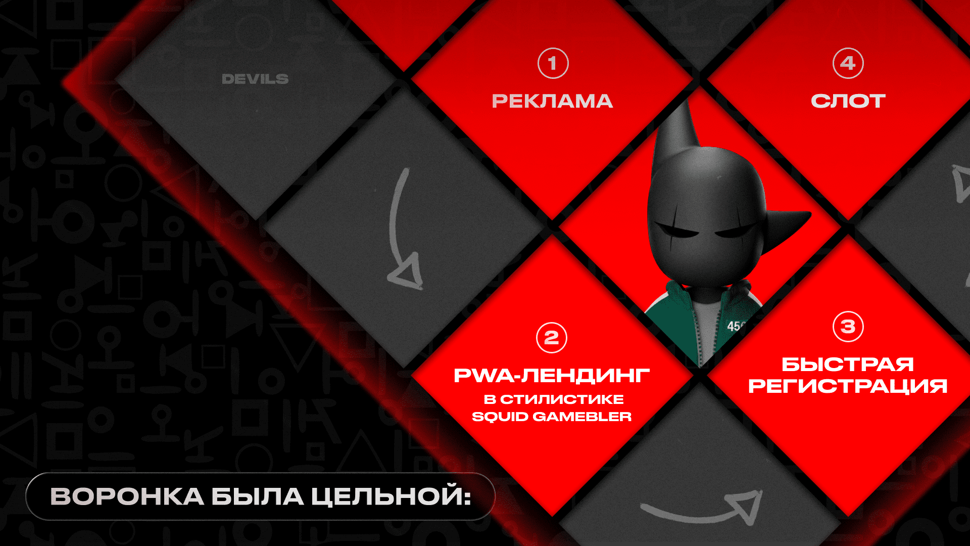 С этого момента объём трафика был сразу направлен на PWA. Здесь у нас была большая свобода кастомизации: мы оформили лендинг под стилистику Squid Gamеbler, добавили корейский язык и валюту (воны) и бонусы от оффера. За счёт этого воронка выглядела цельно, а конверсия в депозит держалась на нужном уровне одновременно с окупаемостью