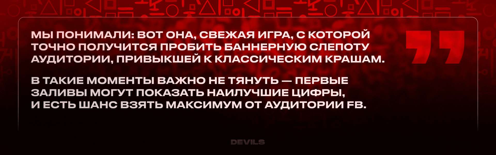 Популярность ключа Squid Gamе напрямую усиливала запуск: пользователь узнавал игру ещё на этапе креатива. За счёт этого реклама набирала обороты быстрее, а игра получала буст в аукционе, поэтому мы приступили к действиям.
