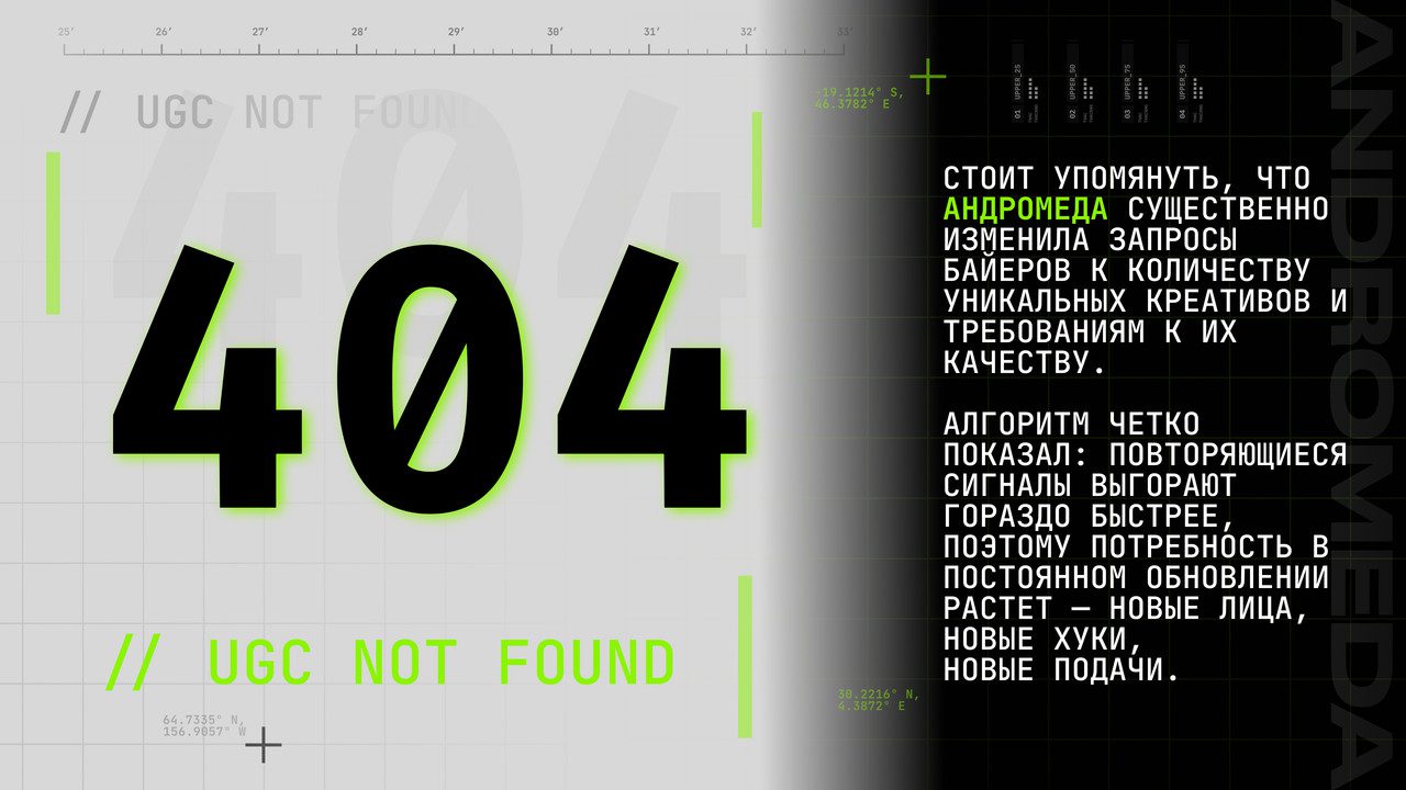 Ключевой инсайт Андромеды заключается в том, что образ в рекламе должен максимально напоминать образ реального пользователя. И речь идет не только о схожих болях или мотивах, но и о визуальной идентификации: масс-маркет одежда, базовые прически, естественный макияж, отсутствие глянца. Креативы в стиле «успешный успех», демонстративное богатство и нереалистичный лайфстайл начали массово терять эффективность.