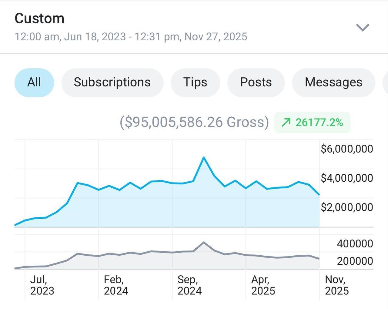 С июня 2023 года её заработок вырос от нескольких тысяч долларов в месяц до почти $6 миллионов в ноябре 2025 года. Такой стремительный рост сделал её одной из самых успешных создательниц контента на платформе.